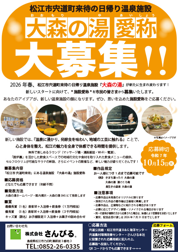 松江市宍道町来待の日帰り温泉施設『大森の湯』愛称募集のお知らせです!!