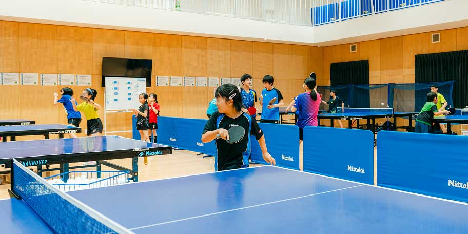 県内で最大級の広さを誇り、冷暖房完備の卓球場で、自分に合ったスタイルのクラスにご参加いただけます。無料体験日も設けておりますので、ぜひお気軽にご参加ください。